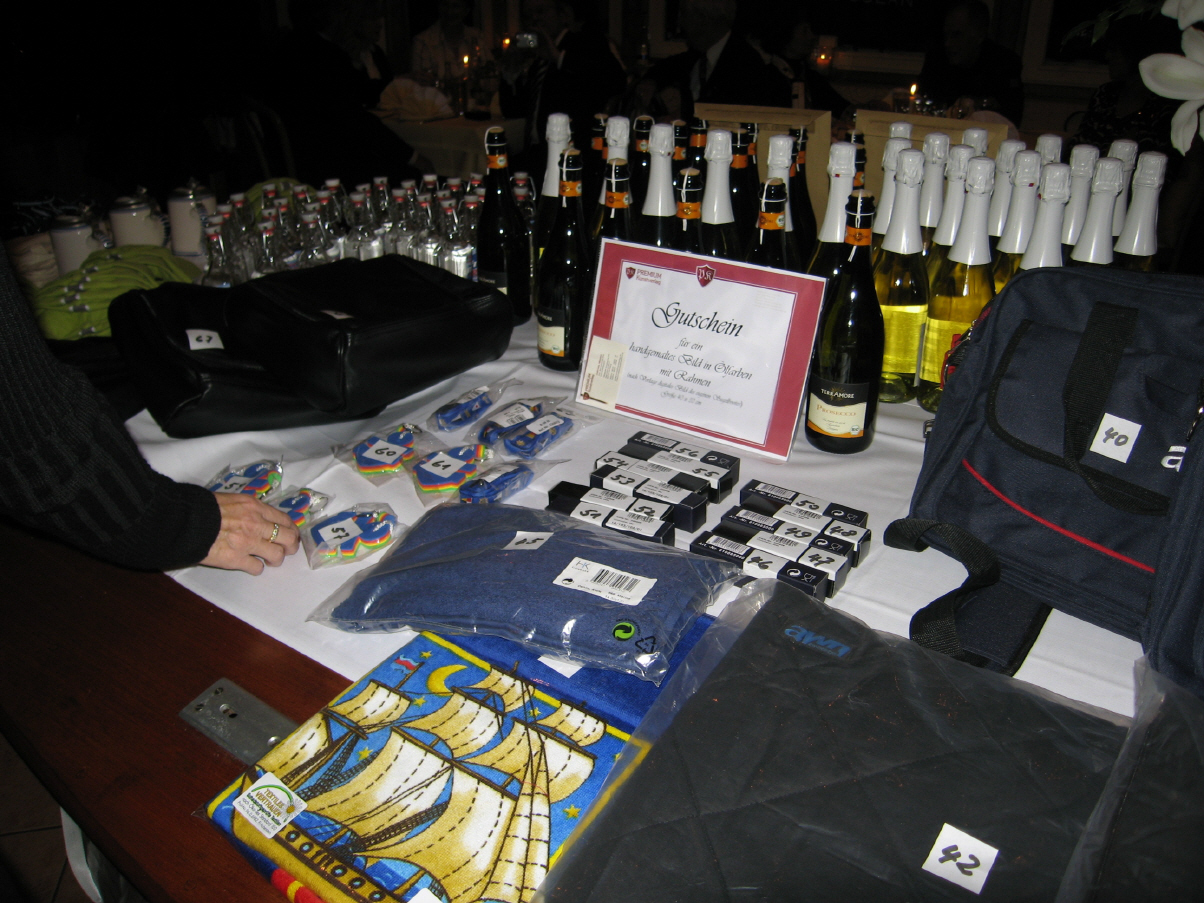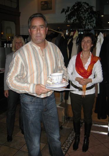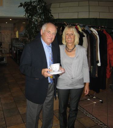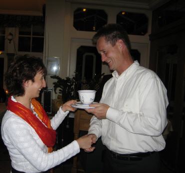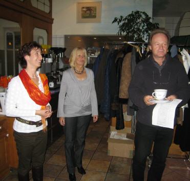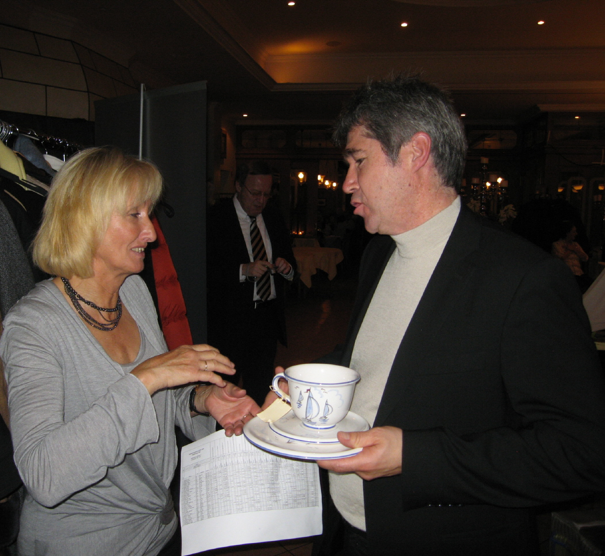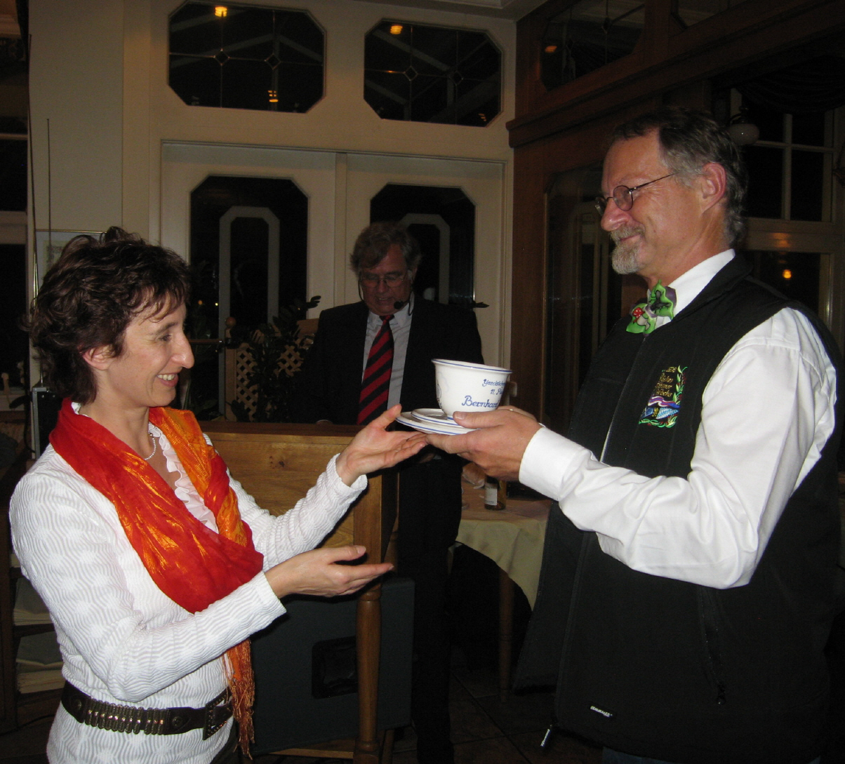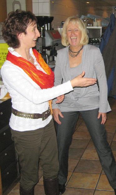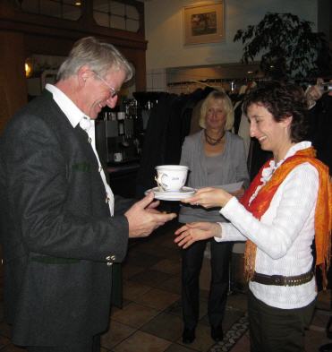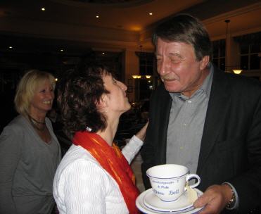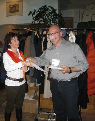 Frau Stahnke (Sponsor A.W. Niemeyer) spendet für die kommenden kalten Monate Trost in Form eines Sherry (in den Hals) und eines Schals (um den Hals) |