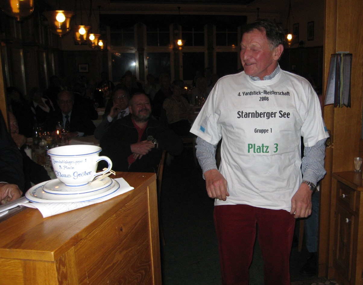 2007 belegte er mit seiner neuen Grand Surprise den 10. Platz. Ein neues Schiff muss man ja erst kennen lernen, sagt man. In diesem Jahr konnte der vom Starnberger See nicht wegzudenkende Segelenthusiast den 5. Platz in der Gruppe 1 erreichen. Er segelte unglaubliche 15 Regatten, von denen er 2 gewann. Josef Schröck von der CKA. Neben seinem Punktpreis erhielt er den Preis für den aktivsten Segler 2008. |