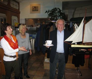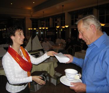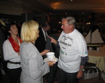 Renate Bell (links im Bild) überläßt Christine die Übergabe des Preises für den 8. Platz in der Gruppe 2 an Ihren Steuermann Matthias Bell vom FSV auf seinem H-Boot. In 8 Regatten ist er gestartet, 2 davon hat er gewonnen. |