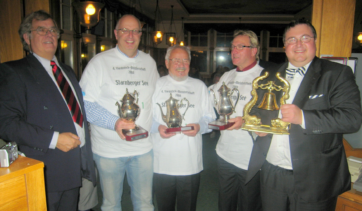 Yardstickausschuss-Vorsitzender Hans Stickler überreichte den Siegern die Wanderpeise: (V.l.n.r) Robert Huber (Seemeister Gruppe 1), Heinrich Hasenfratz (Seemeister Gruppe 3), Uwe Pofandt (Seemeister Gruppe 2), Vorstandsvorsitzender des FSV Klaus Zernick (erfolgreichster Segelverein) |