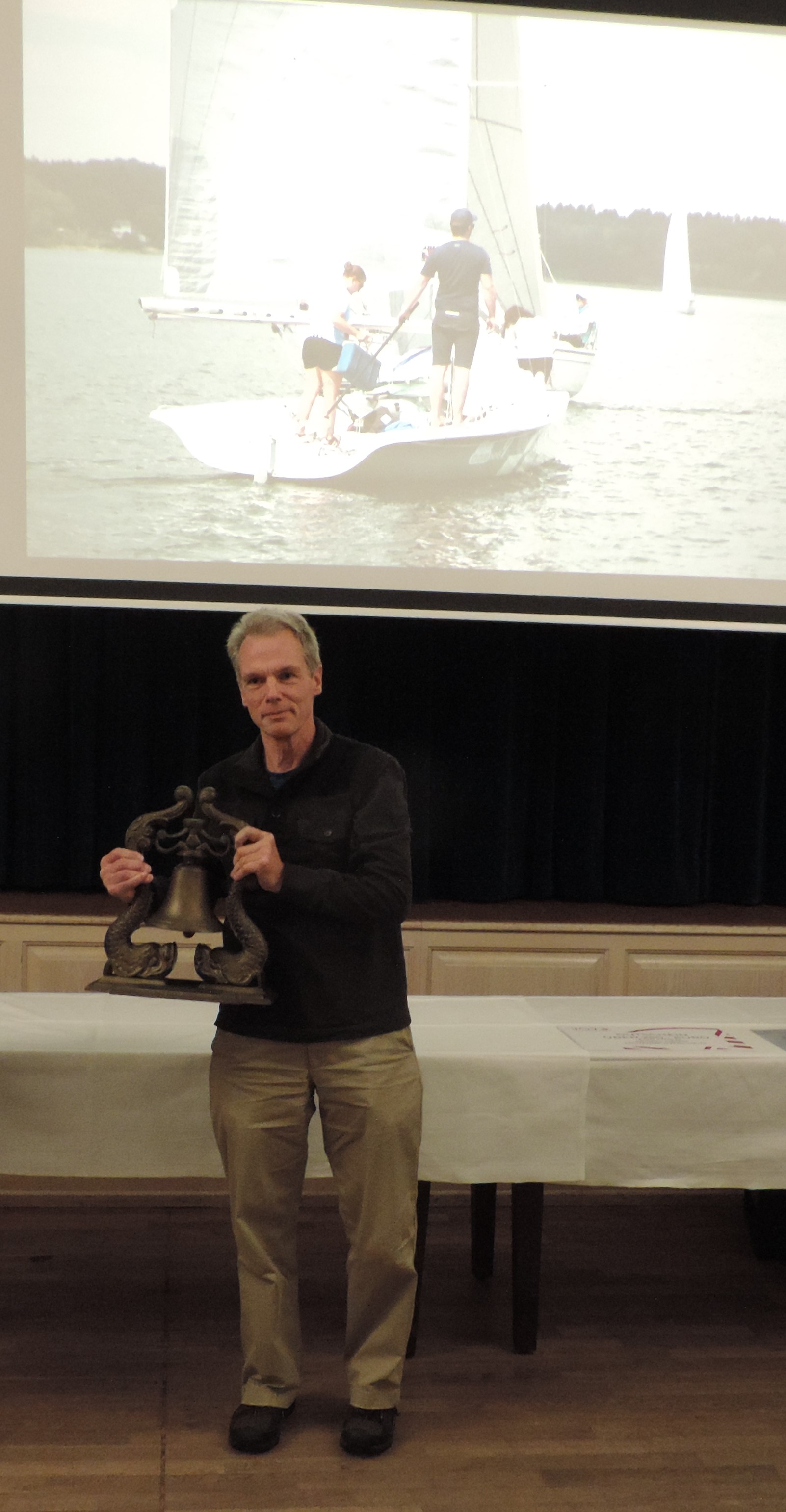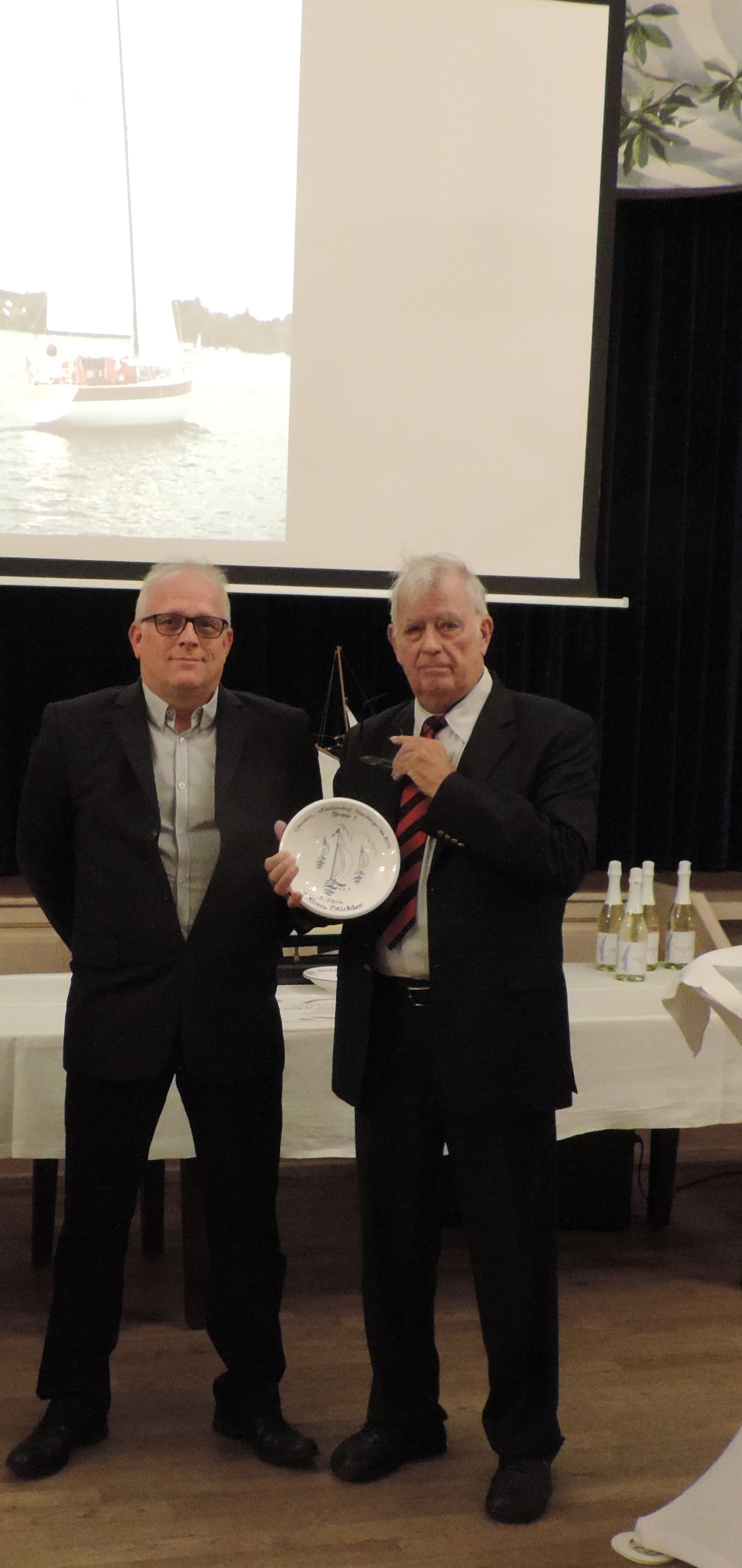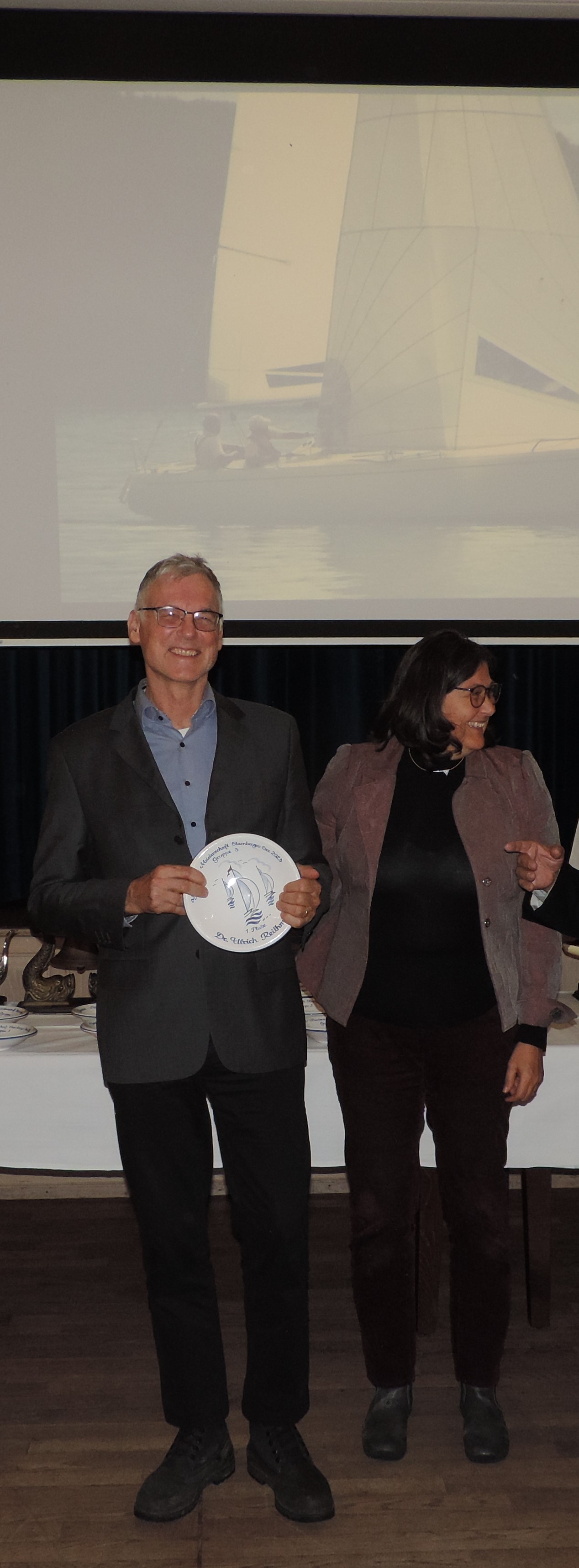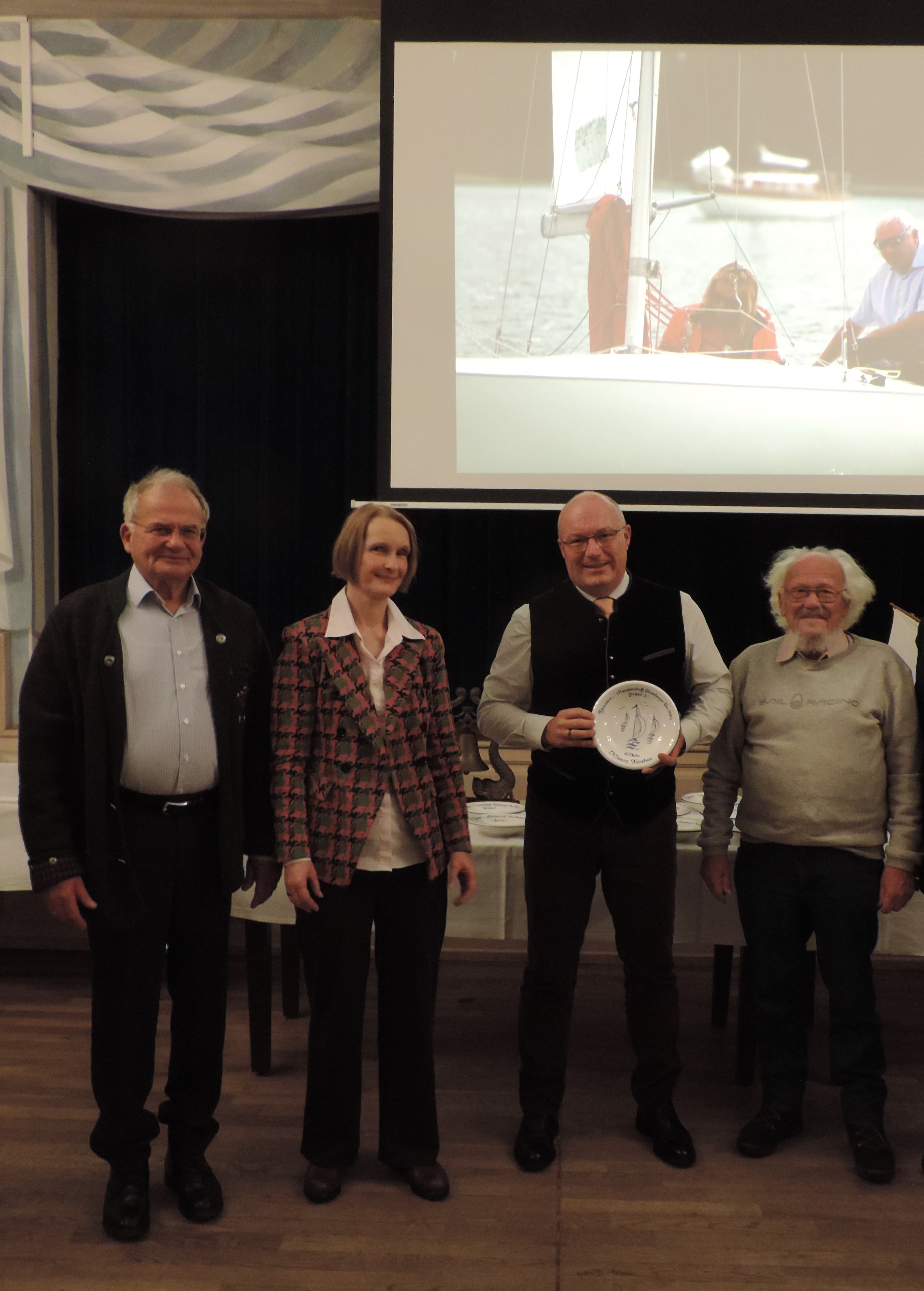 Mit 4 gesegelten Regatten erreichte Peter Wappler vom YCStH mit seiner Cometino 770 den Punktpreis für seinen Platz 3 in der Gruppe 3. Eine Regatta hat er gewonnen. Er war vertreten durch seinen Vorschoter Gerhard Stahl (Foto links), der mit Peter Wappler seit fast einem halben Jahrhundert als Vorschoter unterwegs ist. Gerhard Stahl legt Wert auf die Feststellung, dass er seine Spezialkrawatte ausschließlich in Seemeisterschaftsfeiern trägt (siehe schon 2006 Bild rechts). |