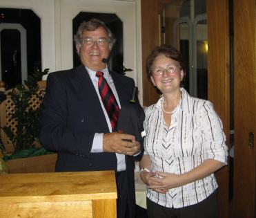Renate Bell (links im Bild) überläßt Christine die Übergabe des Preises für den 8. Platz in der Gruppe 2 an Ihren Steuermann Matthias Bell vom FSV auf seinem H-Boot. In 8 Regatten ist er gestartet, 2 davon hat er gewonnen. |