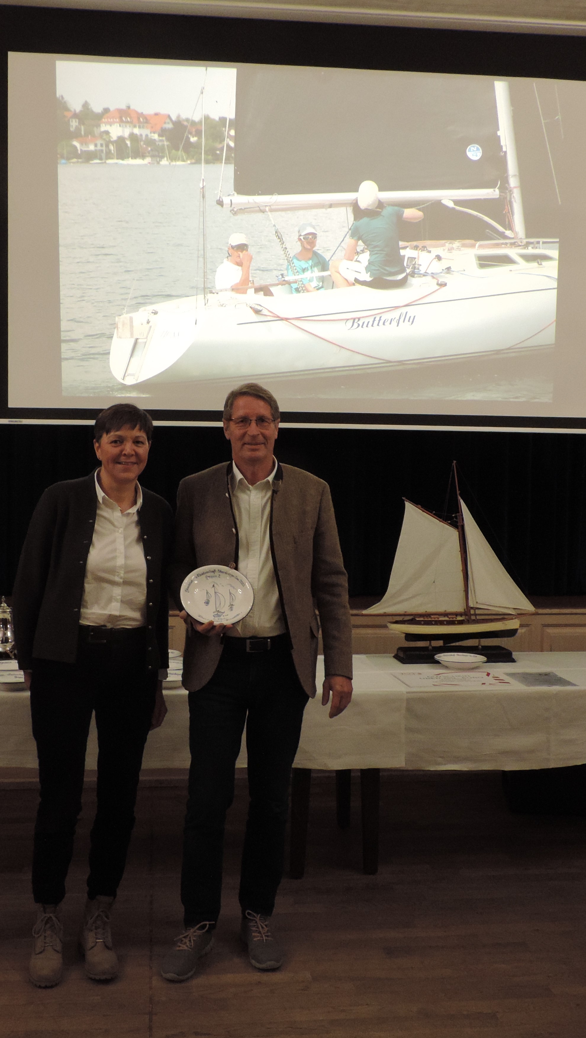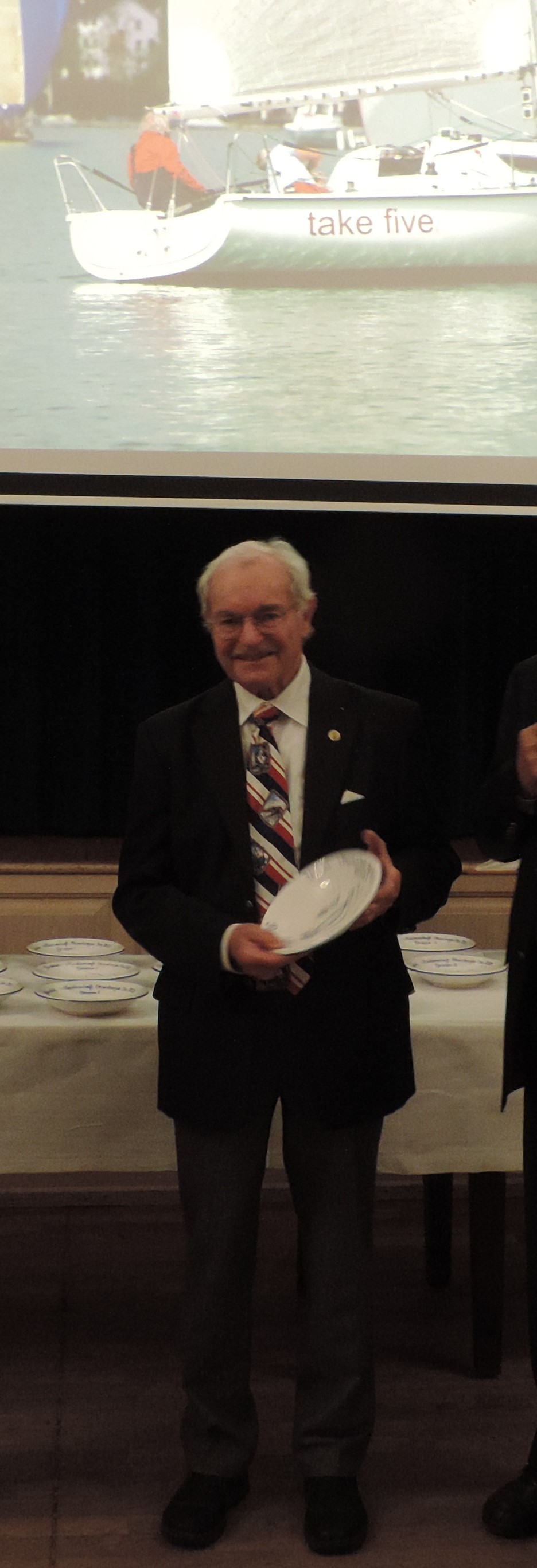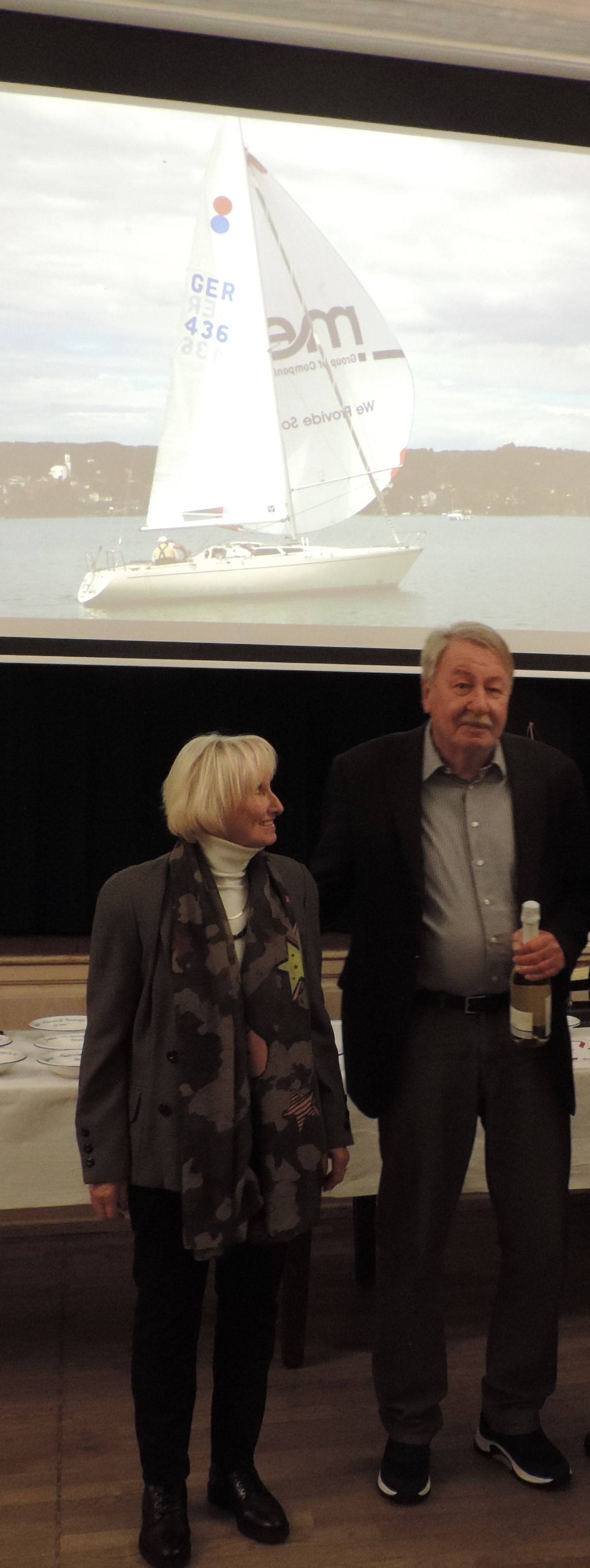 Mit 4 gesegelten Regatten erreichte Peter Wappler vom YCStH mit seiner Cometino 770 den Punktpreis für seinen Platz 3 in der Gruppe 3. Eine Regatta hat er gewonnen. Er war vertreten durch seinen Vorschoter Gerhard Stahl (Foto links), der mit Peter Wappler seit fast einem halben Jahrhundert als Vorschoter unterwegs ist. Gerhard Stahl legt Wert auf die Feststellung, dass er seine Spezialkrawatte ausschließlich in Seemeisterschaftsfeiern trägt (siehe schon 2006 Bild rechts). |